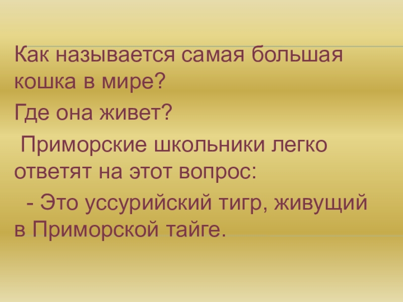 Как называется самая большая кошка в мире? Где она живет? Приморские школьники легко ответят на этот вопрос: - Это уссурийский тигр, живущий в Приморской тайге.
