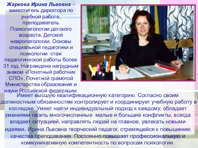 Жаркова Ирина Львовна – заместитель директора по учебной работе, преподаватель Психопатологии детского возраста, Детской невропатологии, Основы специальной педагогики и психологии стаж педагогической работы более 31 год. Награждена нагрудным знаком «Почетный работник СПО», Почетной грамотой Министерства образования и науки Российской федерации.