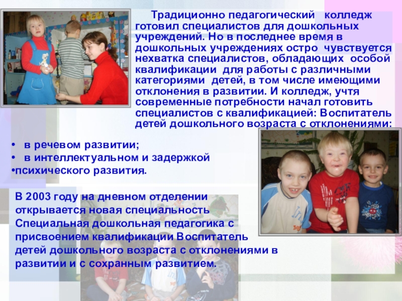 В 2003 году на дневном отделении открывается новая специальность Специальная дошкольная педагогика с присвоением квалификации Воспитатель детей дошкольного возраста с отклонениями в развитии и с сохранным развитием.