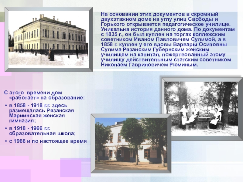 в 1858 - 1918 г.г. здесь размещалась Рязанская Мариинская женская гимназия;
