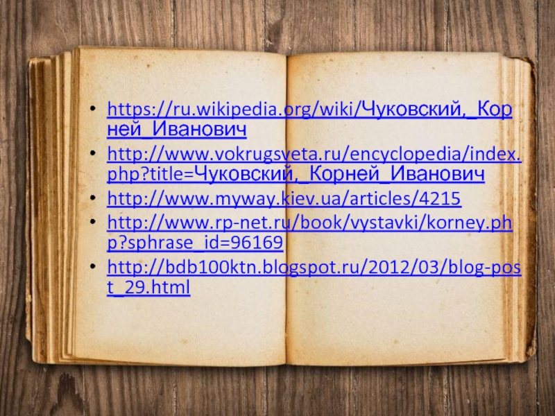 https://ru.wikipedia.org/wiki/Чуковский,_Корней_Ивановичhttp://www.vokrugsveta.ru/encyclopedia/index.php?title=Чуковский,_Корней_Иванович http://www.myway.kiev.ua/articles/4215http://www.rp-net.ru/book/vystavki/korney.php?sphrase_id=96169http://bdb100ktn.blogspot.ru/2012/03/blog-post_29.html