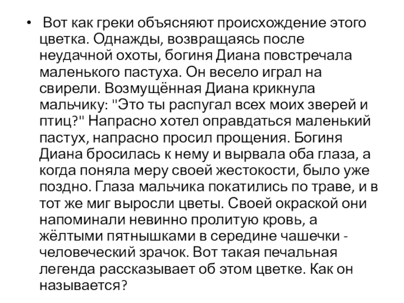 охоты, богиня Диана повстречала маленького пастуха. Он весело играл на свирели. Возмущённая Диана крикнула мальчику: "Это ты распугал всех моих зверей и птиц?" Напрасно хотел оправдаться маленький пастух, напрасно просил прощения. Богиня Диана бросилась к нему и вырвала оба глаза, а когда поняла меру своей жестокости, было уже поздно. Глаза мальчика покатились по траве, и в тот же миг выросли цветы. Своей окраской они напоминали невинно пролитую кровь, а жёлтыми пятнышками в середине чашечки - человеческий зрачок. Вот такая печальная легенда рассказывает об этом цветке. Как он называется?