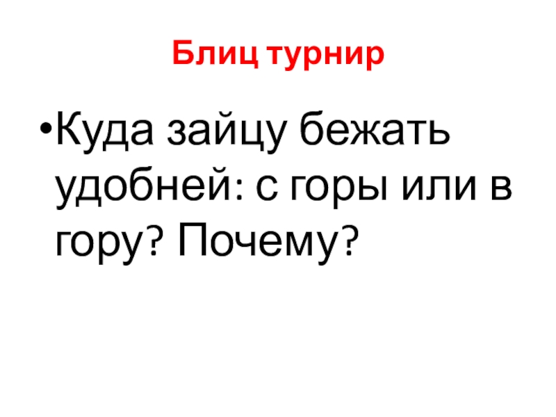 Блиц турнирКуда зайцу бежать удобней: с горы или в гору? Почему?