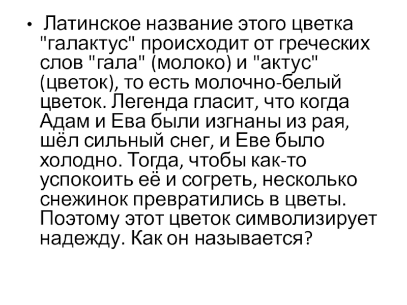 и "актус" (цветок), то есть молочно-белый цветок. Легенда гласит, что когда Адам и Ева были изгнаны из рая, шёл сильный снег, и Еве было холодно. Тогда, чтобы как-то успокоить её и согреть, несколько снежинок превратились в цветы. Поэтому этот цветок символизирует надежду. Как он называется?