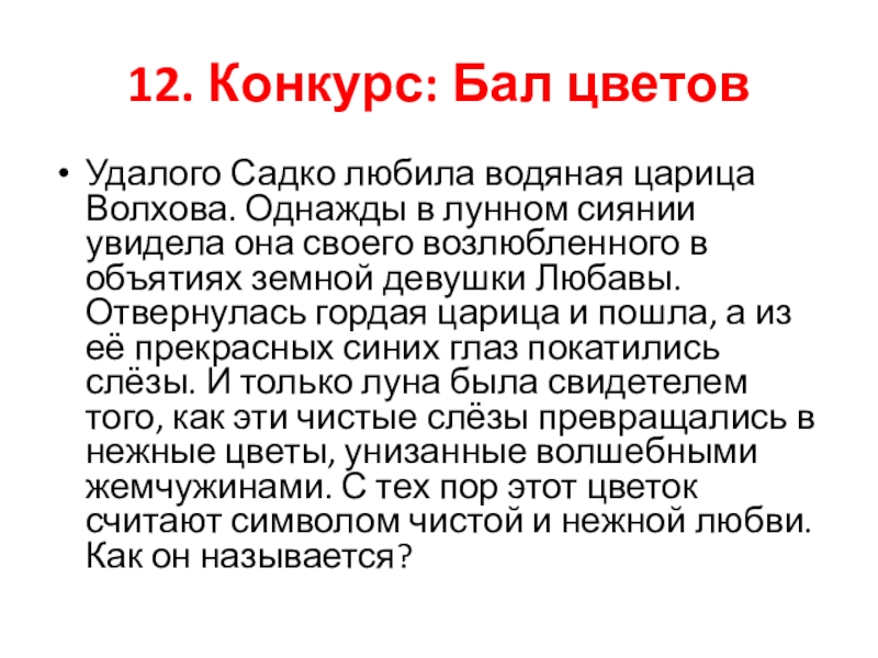 12. Конкурс: Бал цветов Удалого Садко любила водяная царица Волхова. Однажды в лунном сиянии увидела она своего