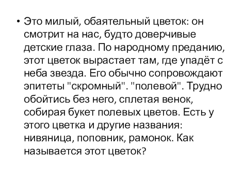 глаза. По народному преданию, этот цветок вырастает там, где упадёт с неба звезда. Его обычно сопровождают эпитеты "скромный". "полевой". Трудно обойтись без него, сплетая венок, собирая букет полевых цветов. Есть у этого цветка и другие названия: нивяница, поповник, рамонок. Как называется этот цветок?