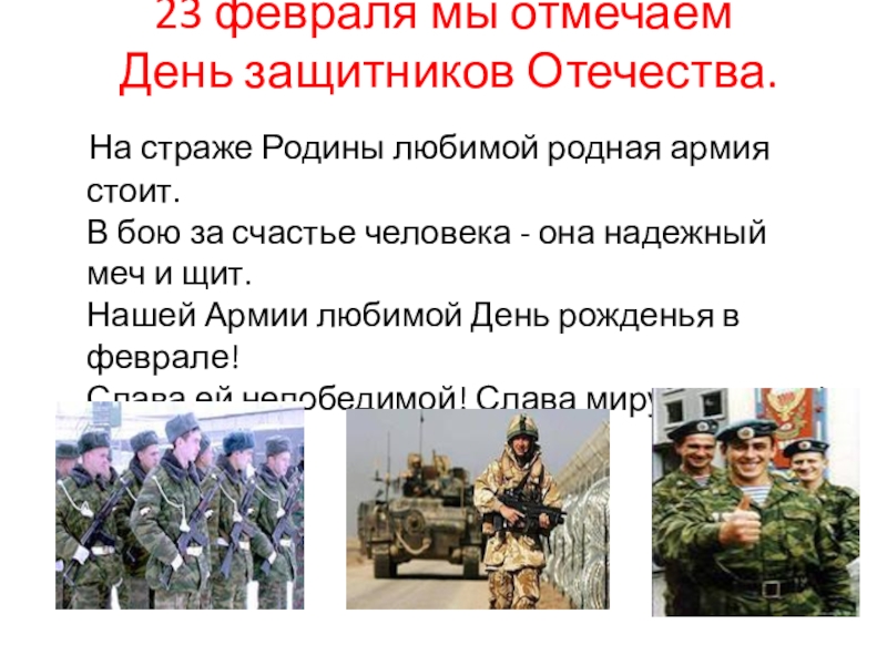 23 февраля мы отмечаем День защитников Отечества. На страже Родины любимой родная армия стоит. В бою за счастье человека - она надежный меч и щит. Нашей Армии любимой День рожденья в феврале!