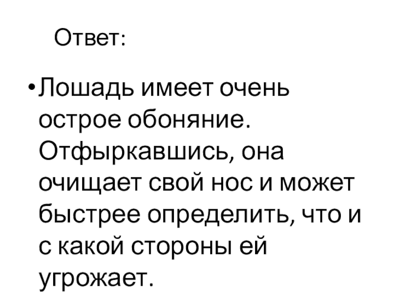 Ответ:Лошадь имеет очень острое обоняние. Отфыркавшись, она очищает свой нос и может быстрее определить, что и с