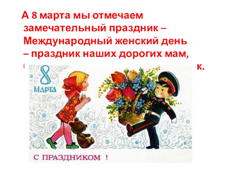 А 8 марта мы отмечаем замечательный праздник – Международный женский день – праздник наших дорогих мам,
