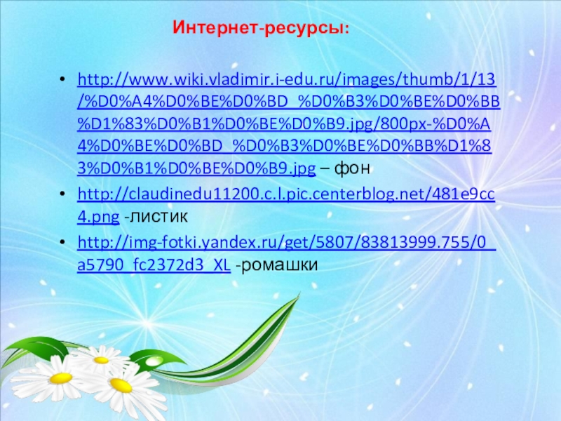 http://www.wiki.vladimir.i-edu.ru/images/thumb/1/13/%D0%A4%D0%BE%D0%BD_%D0%B3%D0%BE%D0%BB%D1%83%D0%B1%D0%BE%D0%B9.jpg/800px-%D0%A4%D0%BE%D0%BD_%D0%B3%D0%BE%D0%BB%D1%83%D0%B1%D0%BE%D0%B9.jpg – фонhttp://claudinedu11200.c.l.pic.centerblog.net/481e9cc4.png -листикhttp://img-fotki.yandex.ru/get/5807/83813999.755/0_a5790_fc2372d3_XL -ромашкиИнтернет-ресурсы: