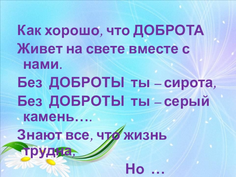 Как хорошо, что ДОБРОТА Живет на свете вместе с нами. Без ДОБРОТЫ ты – сирота, Без