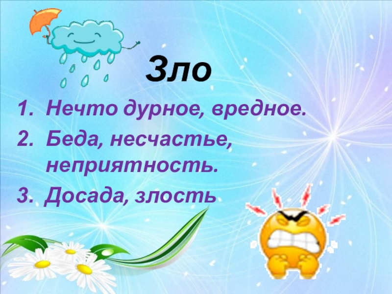 ЗлоНечто дурное, вредное.Беда, несчастье, неприятность.Досада, злость