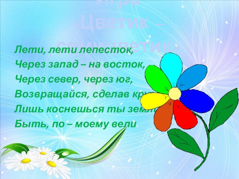 Игра  «Цветик – семицветик»Лети, лети лепесток,Через запад – на восток,Через север, через юг,Возвращайся, сделав круг.Лишь коснешься