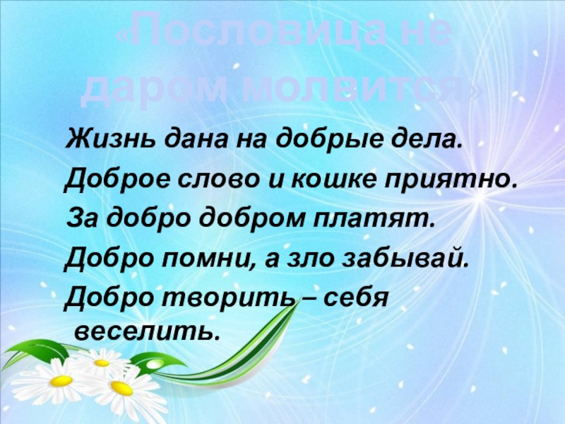 «Пословица не даром молвится» Жизнь дана на добрые дела. Доброе слово и кошке приятно. За добро добром