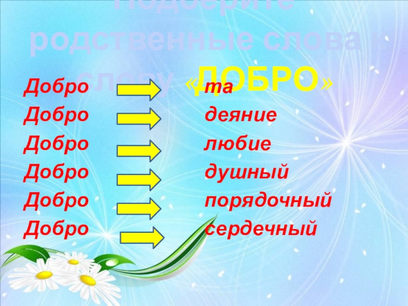 Слайд 16Подберите родственные слова к слову «ДОБРО»