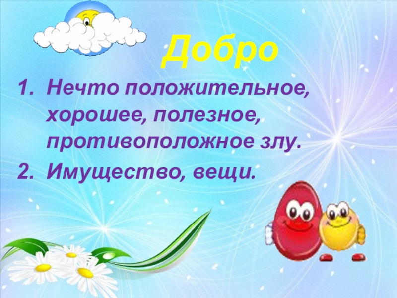 ДоброНечто положительное, хорошее, полезное, противоположное злу.Имущество, вещи.