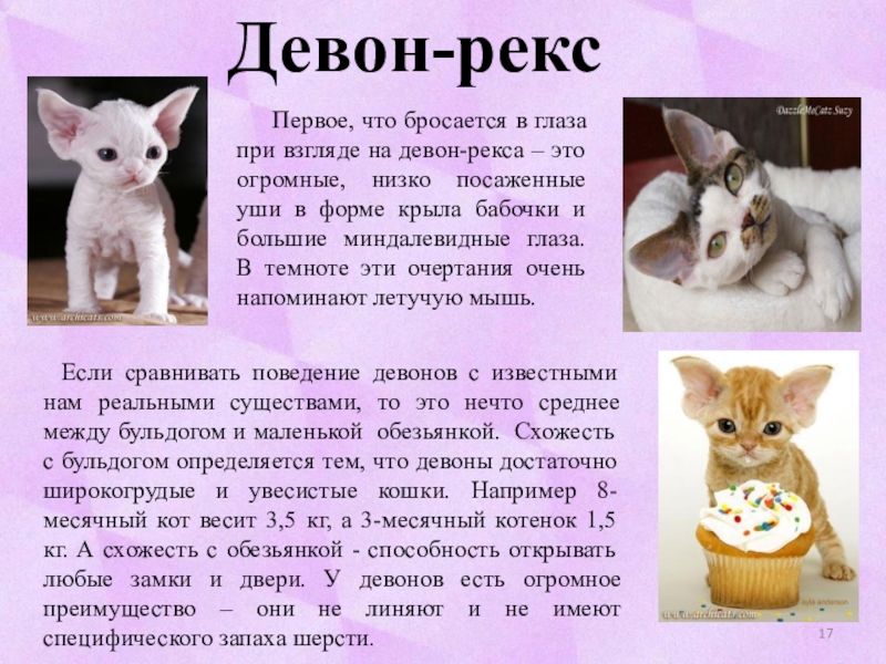 Если сравнивать поведение девонов с известными нам реальными существами, то это нечто среднее между бульдогом и маленькой обезьянкой. Схожесть с бульдогом определяется тем, что девоны достаточно широкогрудые и увесистые кошки. Например 8-месячный кот весит 3,5 кг, а 3-месячный котенок 1,5 кг. А схожесть с обезьянкой - способность открывать любые замки и двери. У девонов есть огромное преимущество – они не линяют и не имеют специфического запаха шерсти.