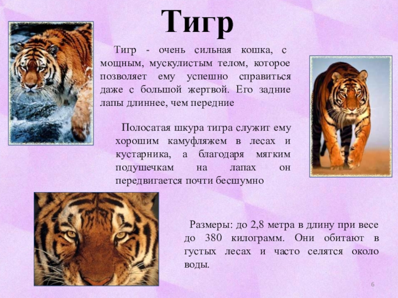 Тигр - очень сильная кошка, с мощным, мускулистым телом, которое позволяет ему успешно справиться даже с большой жертвой. Его задние лапы длиннее, чем передние