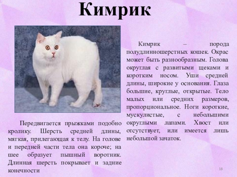 Кимрик – порода полудлинношерстных кошек. Окрас может быть разнообразным. Голова округлая с развитыми щеками и коротким носом. Уши средней длины, широкие у основания. Глаза большие, круглые, открытые. Тело малых или средних размеров, пропорциональное. Ноги короткие, мускулистые, с небольшими округлыми лапами. Хвост или отсутствует, или имеется лишь небольшой зачаток.