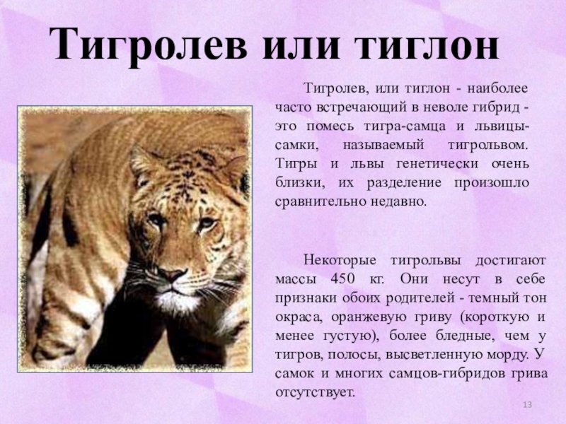 Некоторые тигрольвы достигают массы 450 кг. Они несут в себе признаки обоих родителей - темный тон окраса, оранжевую гриву (короткую и менее густую), более бледные, чем у тигров, полосы, высветленную морду. У самок и многих самцов-гибридов грива отсутствует.