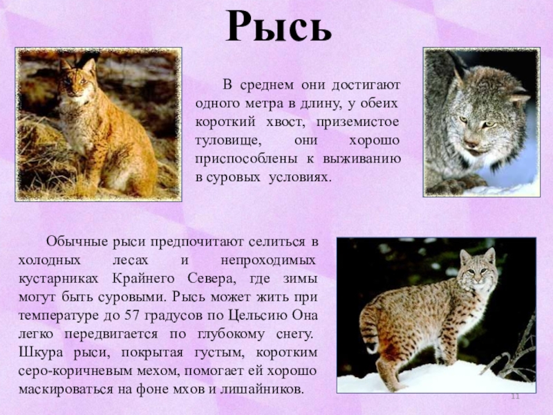Обычные рыси предпочитают селиться в холодных лесах и непроходимых кустарниках Крайнего Севера, где зимы могут быть суровыми. Рысь может жить при температуре до 57 градусов по Цельсию Она легко передвигается по глубокому снегу. Шкура рыси, покрытая густым, коротким серо-коричневым мехом, помогает ей хорошо маскироваться на фоне мхов и лишайников.