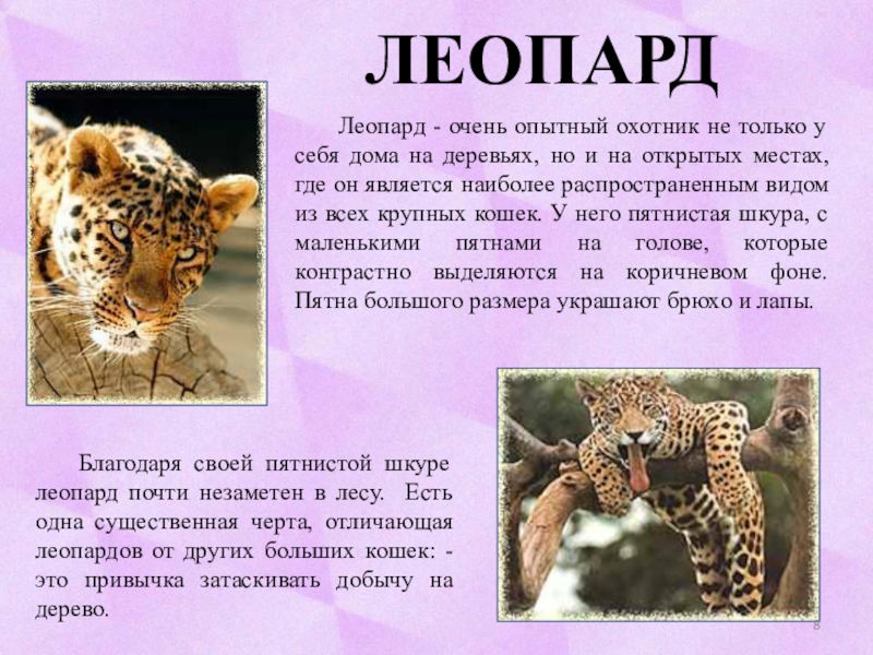Благодаря своей пятнистой шкуре леопард почти незаметен в лесу. Есть одна существенная черта, отличающая леопардов от других больших кошек: - это привычка затаскивать добычу на дерево.