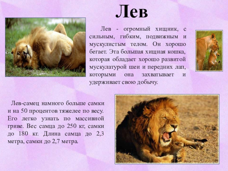 Лев-самец намного больше самки и на 50 процентов тяжелее по весу. Его легко узнать по массивной гриве. Вес самца до 250 кг, самки до 180 кг. Длина самца до 2,3 метра, самки до 2,7 метра.