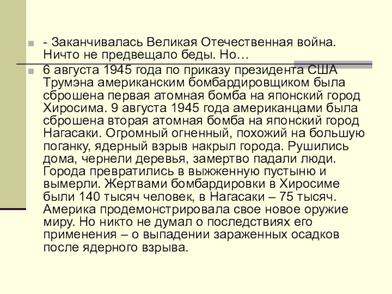 1945 года по приказу президента США Трумэна американским бомбардировщиком была сброшена первая атомная бомба на японский город Хиросима. 9 августа 1945 года американцами была сброшена вторая атомная бомба на японский город Нагасаки. Огромный огненный, похожий на большую поганку, ядерный взрыв накрыл города. Рушились дома, чернели деревья, замертво падали люди. Города превратились в выжженную пустыню и вымерли. Жертвами бомбардировки в Хиросиме были 140 тысяч человек, в Нагасаки – 75 тысяч. Америка продемонстрировала свое новое оружие миру. Но никто не думал о последствиях его применения – о выпадении зараженных осадков после ядерного взрыва.