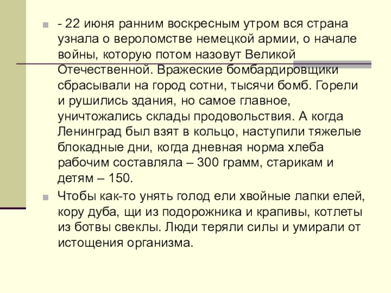 немецкой армии, о начале войны, которую потом назовут Великой Отечественной. Вражеские бомбардировщики сбрасывали на город сотни, тысячи бомб. Горели и рушились здания, но самое главное, уничтожались склады продовольствия. А когда Ленинград был взят в кольцо, наступили тяжелые блокадные дни, когда дневная норма хлеба рабочим составляла – 300 грамм, старикам и детям – 150.