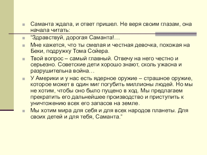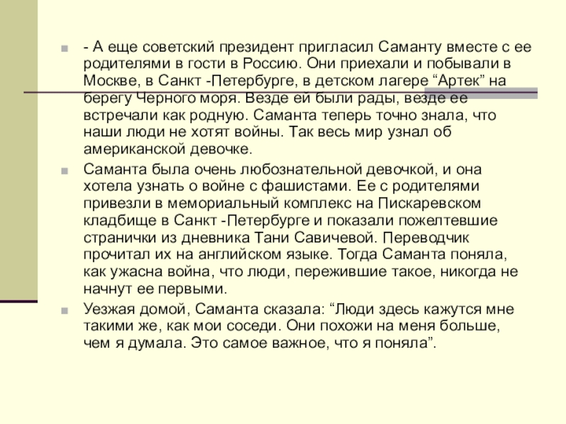 в гости в Россию. Они приехали и побывали в Москве, в Санкт -Петербурге, в детском лагере “Артек” на берегу Черного моря. Везде ей были рады, везде ее встречали как родную. Саманта теперь точно знала, что наши люди не хотят войны. Так весь мир узнал об американской девочке.