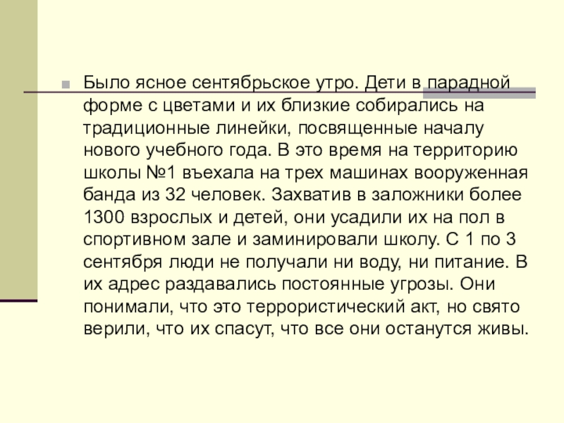 их близкие собирались на традиционные линейки, посвященные началу нового учебного года. В это время на территорию школы №1 въехала на трех машинах вооруженная банда из 32 человек. Захватив в заложники более 1300 взрослых и детей, они усадили их на пол в спортивном зале и заминировали школу. С 1 по 3 сентября люди не получали ни воду, ни питание. В их адрес раздавались постоянные угрозы. Они понимали, что это террористический акт, но свято верили, что их спасут, что все они останутся живы.