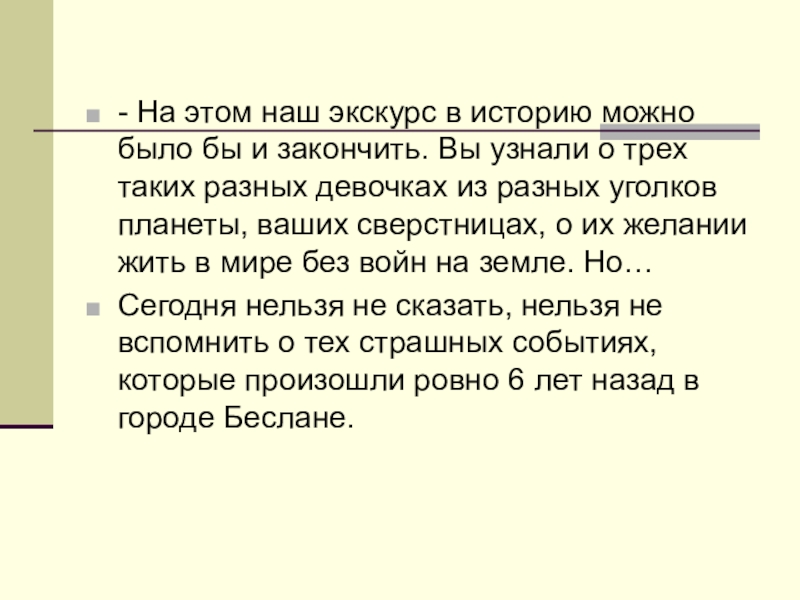 закончить. Вы узнали о трех таких разных девочках из разных уголков планеты, ваших сверстницах, о их желании жить в мире без войн на земле. Но…