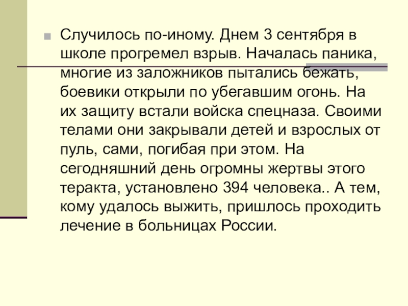 многие из заложников пытались бежать, боевики открыли по убегавшим огонь. На их защиту встали войска спецназа. Своими телами они закрывали детей и взрослых от пуль, сами, погибая при этом. На сегодняшний день огромны жертвы этого теракта, установлено 394 человека.. А тем, кому удалось выжить, пришлось проходить лечение в больницах России.