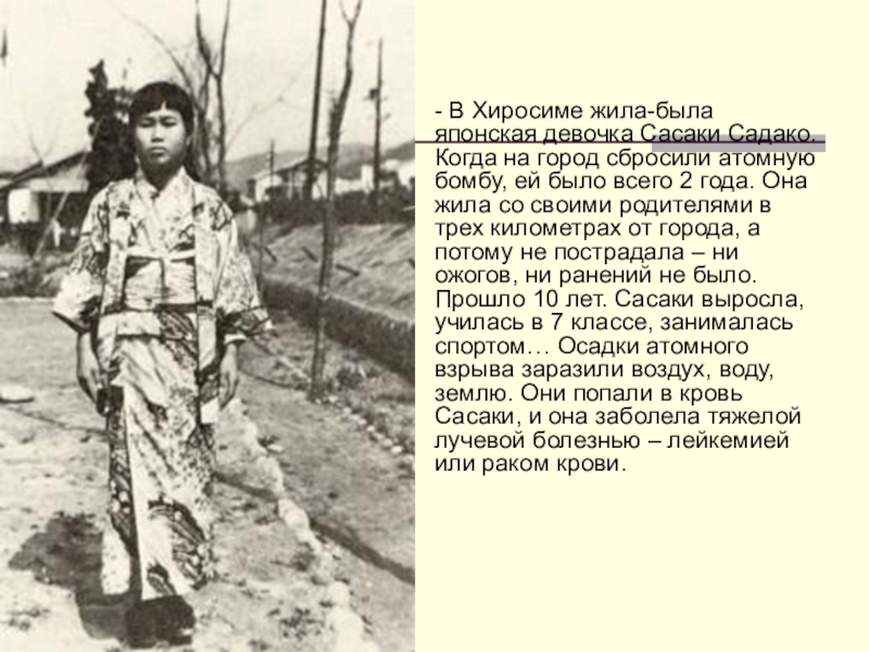 сбросили атомную бомбу, ей было всего 2 года. Она жила со своими родителями в трех километрах от города, а потому не пострадала – ни ожогов, ни ранений не было. Прошло 10 лет. Сасаки выросла, училась в 7 классе, занималась спортом… Осадки атомного взрыва заразили воздух, воду, землю. Они попали в кровь Сасаки, и она заболела тяжелой лучевой болезнью – лейкемией или раком крови.