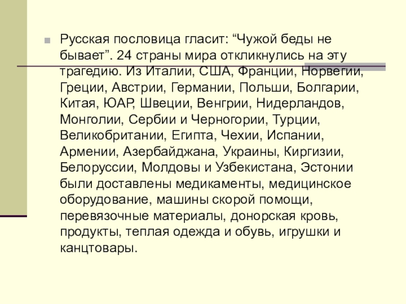 Русская пословица гласит: “Чужой беды не бывает”. 24 страны мира откликнулись