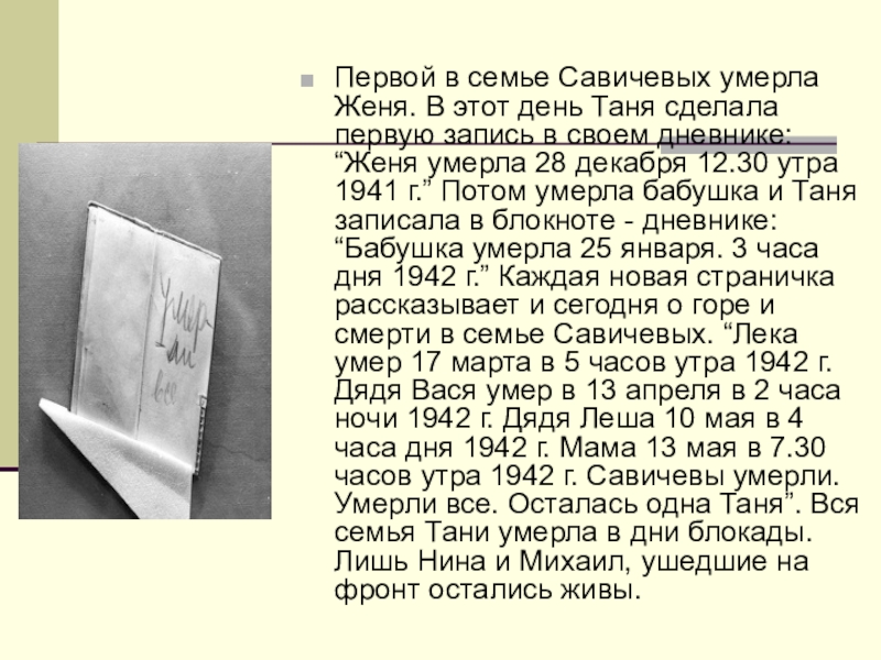 первую запись в своем дневнике: “Женя умерла 28 декабря 12.30 утра 1941 г.” Потом умерла бабушка и Таня записала в блокноте - дневнике: “Бабушка умерла 25 января. 3 часа дня 1942 г.” Каждая новая страничка рассказывает и сегодня о горе и смерти в семье Савичевых. “Лека умер 17 марта в 5 часов утра 1942 г. Дядя Вася умер в 13 апреля в 2 часа ночи 1942 г. Дядя Леша 10 мая в 4 часа дня 1942 г. Мама 13 мая в 7.30 часов утра 1942 г. Савичевы умерли. Умерли все. Осталась одна Таня”. Вся семья Тани умерла в дни блокады. Лишь Нина и Михаил, ушедшие на фронт остались живы.