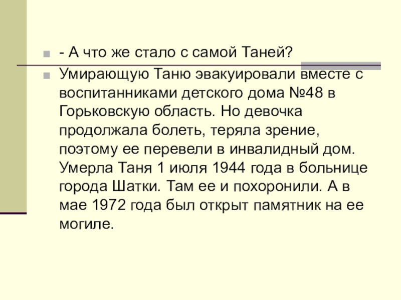 с воспитанниками детского дома №48 в Горьковскую область. Но девочка продолжала болеть, теряла зрение, поэтому ее перевели в инвалидный дом. Умерла Таня 1 июля 1944 года в больнице города Шатки. Там ее и похоронили. А в мае 1972 года был открыт памятник на ее могиле.