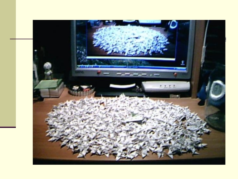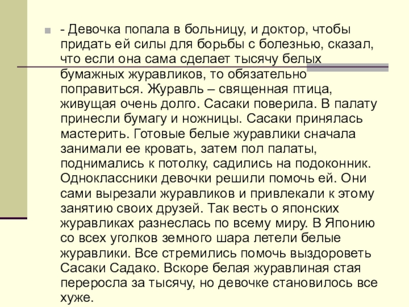 для борьбы с болезнью, сказал, что если она сама сделает тысячу белых бумажных журавликов, то обязательно поправиться. Журавль – священная птица, живущая очень долго. Сасаки поверила. В палату принесли бумагу и ножницы. Сасаки принялась мастерить. Готовые белые журавлики сначала занимали ее кровать, затем пол палаты, поднимались к потолку, садились на подоконник. Одноклассники девочки решили помочь ей. Они сами вырезали журавликов и привлекали к этому занятию своих друзей. Так весть о японских журавликах разнеслась по всему миру. В Японию со всех уголков земного шара летели белые журавлики. Все стремились помочь выздороветь Сасаки Садако. Вскоре белая журавлиная стая переросла за тысячу, но девочке становилось все хуже.