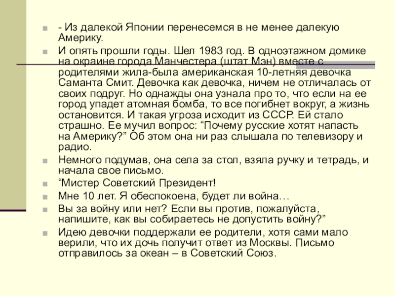 опять прошли годы. Шел 1983 год. В одноэтажном домике на окраине города Манчестера (штат Мэн) вместе с родителями жила-была американская 10-летняя девочка Саманта Смит. Девочка как девочка, ничем не отличалась от своих подруг. Но однажды она узнала про то, что если на ее город упадет атомная бомба, то все погибнет вокруг, а жизнь остановится. И такая угроза исходит из СССР. Ей стало страшно. Ее мучил вопрос: “Почему русские хотят напасть на Америку?” Об этом она ни раз слышала по телевизору и радио.