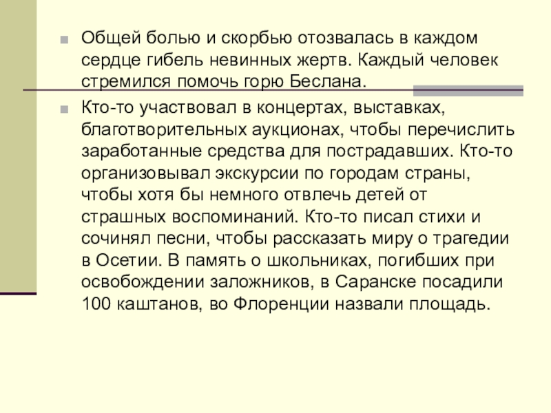 Кто-то участвовал в концертах, выставках, благотворительных аукционах, чтобы перечислить заработанные средства для пострадавших. Кто-то организовывал экскурсии по городам страны, чтобы хотя бы немного отвлечь детей от страшных воспоминаний. Кто-то писал стихи и сочинял песни, чтобы рассказать миру о трагедии в Осетии. В память о школьниках, погибших при освобождении заложников, в Саранске посадили 100 каштанов, во Флоренции назвали площадь.