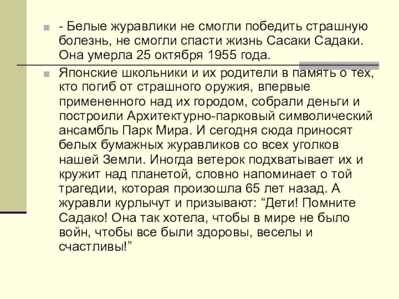 Японские школьники и их родители в память о тех, кто погиб от страшного оружия, впервые примененного над их городом, собрали деньги и построили Архитектурно-парковый символический ансамбль Парк Мира. И сегодня сюда приносят белых бумажных журавликов со всех уголков нашей Земли. Иногда ветерок подхватывает их и кружит над планетой, словно напоминает о той трагедии, которая произошла 65 лет назад. А журавли курлычут и призывают: “Дети! Помните Садако! Она так хотела, чтобы в мире не было войн, чтобы все были здоровы, веселы и счастливы!”