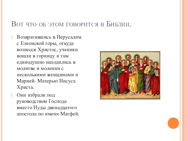 Вот что об этом говорится в Библии.Возвратившись в Иерусалим с Елеонской горы, откуда вознесся Христос, ученики вошли