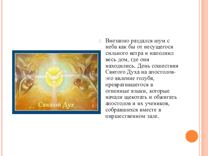 и наполнил весь дом, где они находились. День сошествия Святого Духа на апостолов-это явление голубя, превратившегося в огненные языки, которые начали щекотать и обжигать апостолов и их учеников, собравшихся вместе в пиршественном зале.