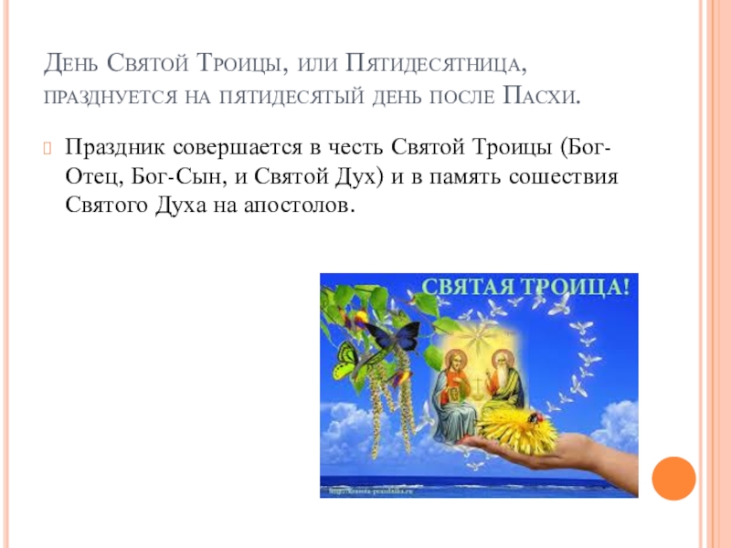 Слайд 2 День Святой Троицы, или Пятидесятница, празднуется на пятидесятый день после Пасхи.