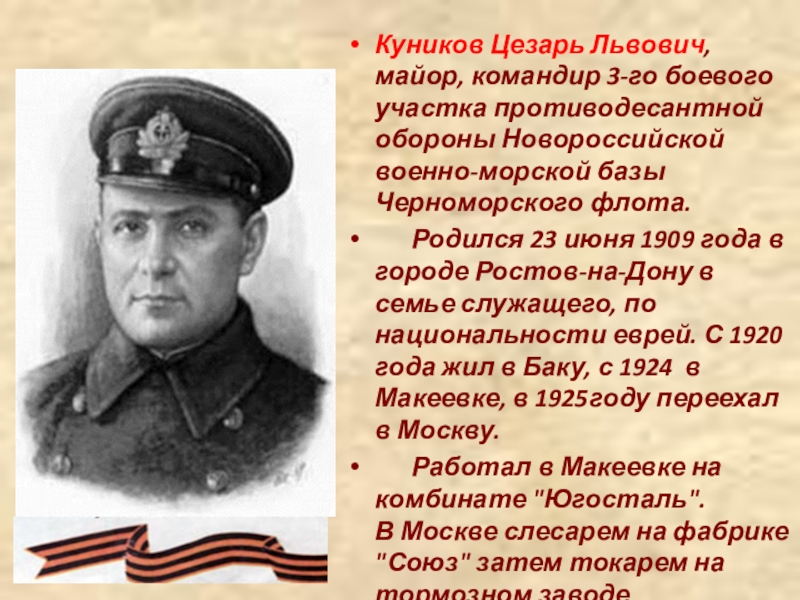 Слайд 11Куников Цезарь Львович, майор, командир 3-го боевого участка противодесантной обороны Новороссийской военно-морской базы