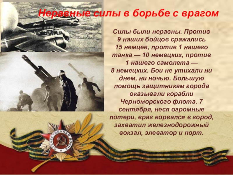 сражались 15 немцев, против 1 нашего танка — 10 немецких, против 1 нашего самолета — 8 немецких. Бои не утихали ни днем, ни ночью. Большую помощь защитникам города оказывали корабли Черноморского флота. 7 сентября, неся огромные потери, враг ворвался в город, захватил железнодорожный вокзал, элеватор и порт.