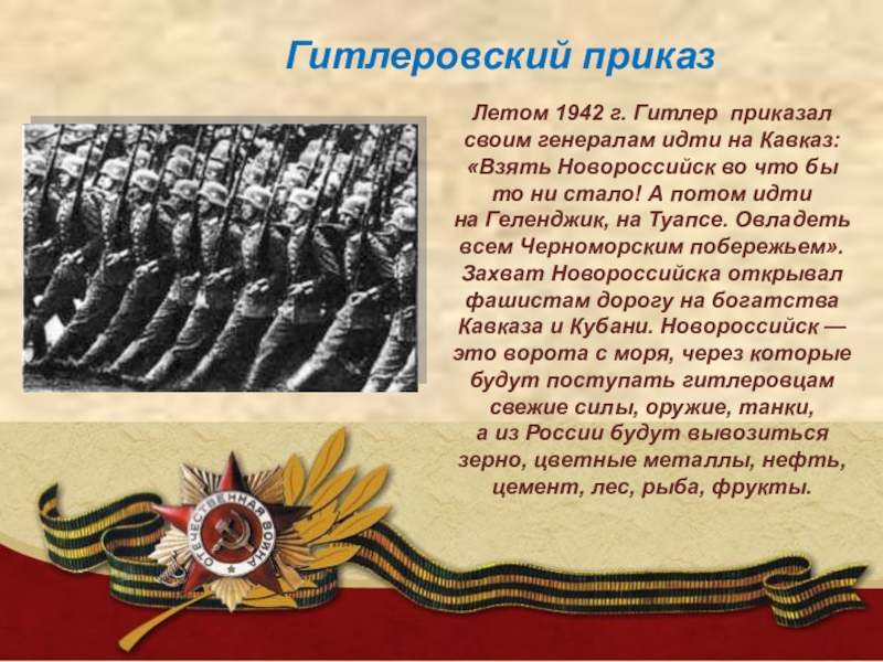 Захват Новороссийска открывал фашистам дорогу на богатства Кавказа и Кубани. Новороссийск — это ворота с моря, через которые будут поступать гитлеровцам свежие силы, оружие, танки, а из России будут вывозиться зерно, цветные металлы, нефть, цемент, лес, рыба, фрукты.