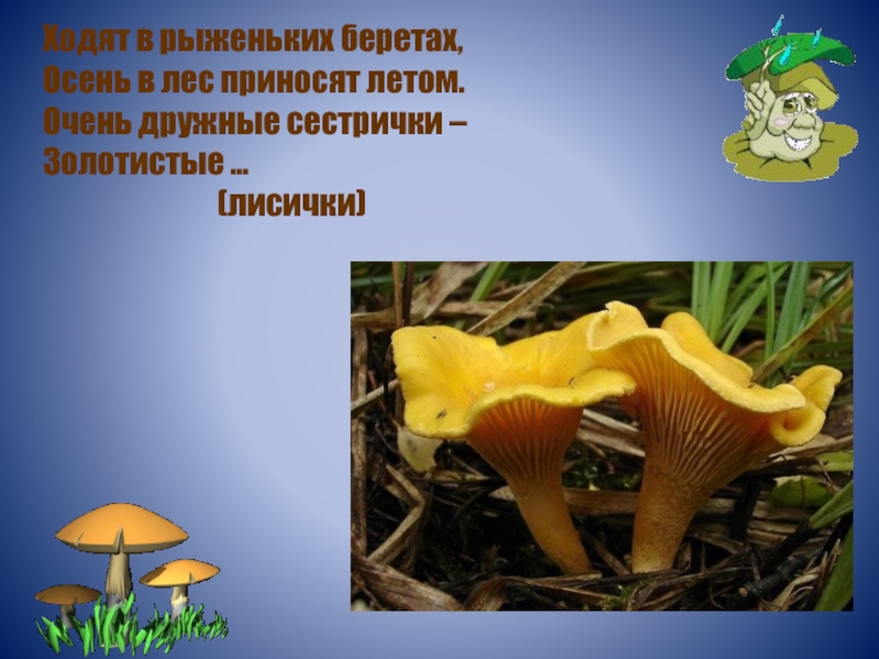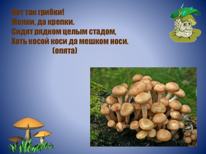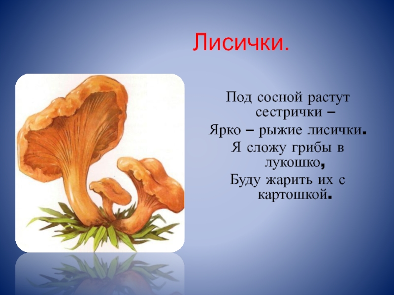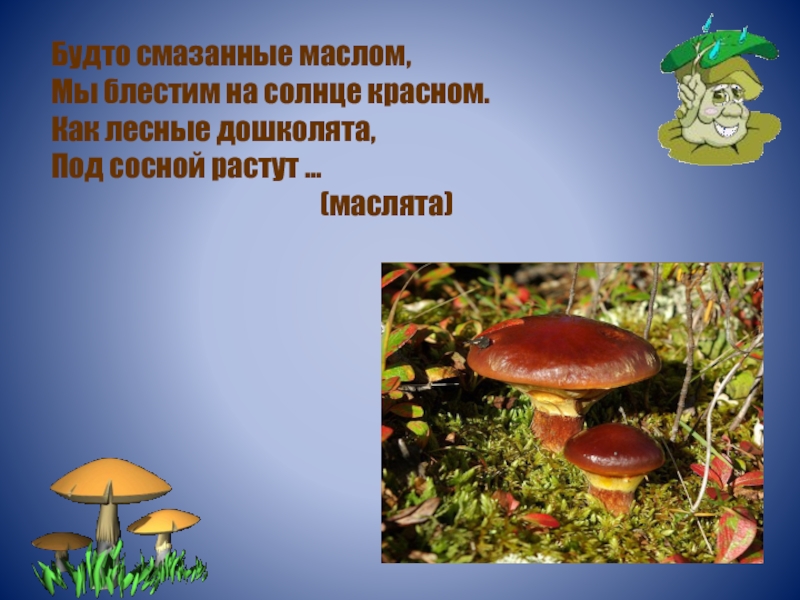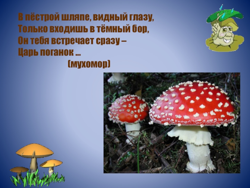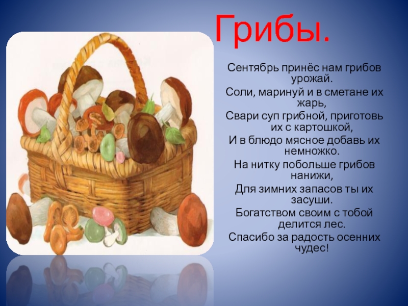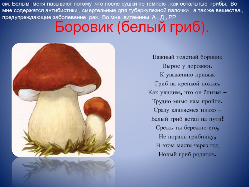 У меня много имен. В народе меня называют боровиком , глухарем и даже медвежатником. А наука дала мне имя , которое мне больше нравится. Я – Белый гриб , грибной царь. Расту под дубом , сосной , елью , березой. Люблю , где много света , соседствую с муравейником , с мухомором. Я гриб – великан . Ножка 20 см , шляпка до 25 см. Белым меня называют потому .что после сушки не темнею , как остальные грибы. Во мне содержатся антибиотики , смертельные для туберкулезной палочки , а так же вещества , предупреждающие заболевание рак. Во мне витамины А , Д , РР
