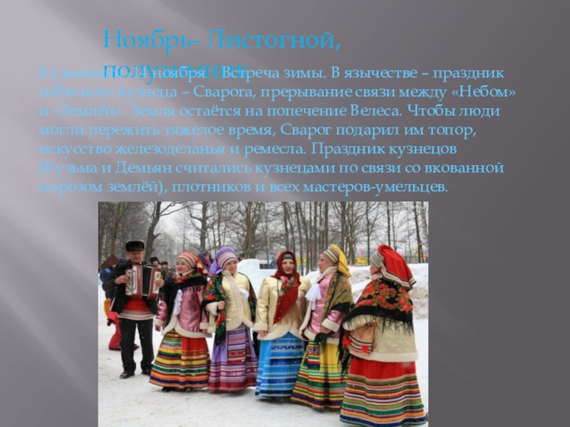 Ноябрь- Листогной, полузимникКузьминки -14 ноября  Встреча зимы. В язычестве – праздник небесного кузнеца – Сварога, прерывание