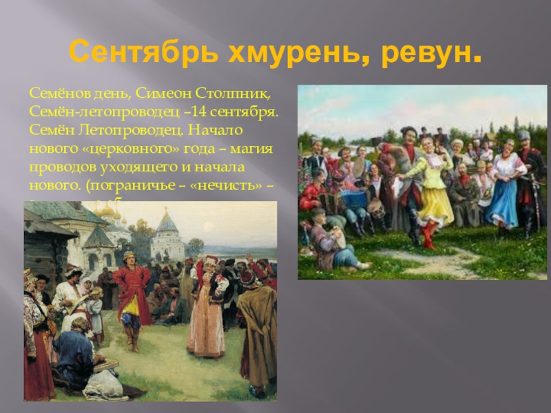 Сентябрь хмурень, ревун. Семёнов день, Симеон Столпник, Семён-летопроводец –14 сентября. Семён Летопроводец. Начало нового «церковного» года – магия проводов уходящего и начала нового. (пограничье – «нечисть» – защитные обряды